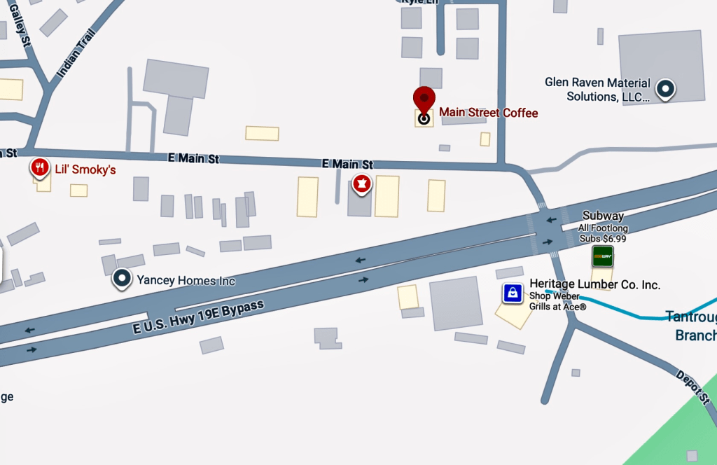 We are located in the heart of Western North Carolina. We meet at the Main Street Cafe, 731 East Main Street, Burnsville, NC.